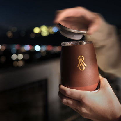 + Patent-pending Sip & Stow lid system+ 3-Way Precision Insulation+ 100% leak proof+ Magnetic lid stows below during use+ Crafted for wine or coffee+ 2 tumblers = 1 bottle of wine+ Aromatic Curved shape for flavor+ Kitchen-grade stainless steel+ No-slide base design+ Dishwasher-safe